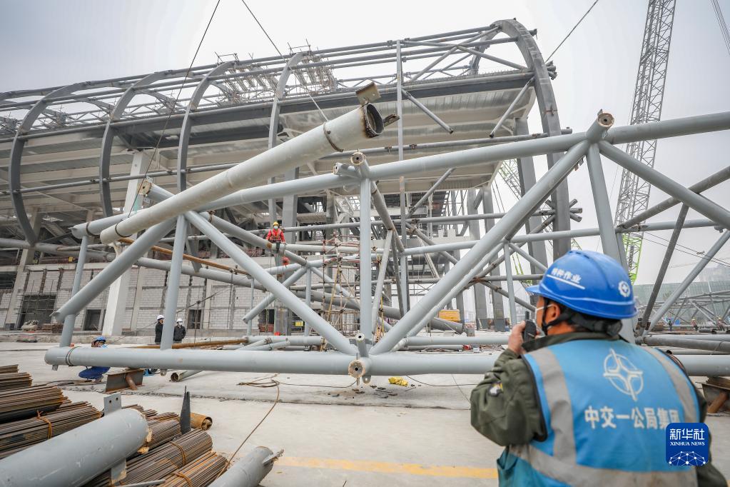 12月16日,在重慶市永川區會展中心項目建設現場,施工人員指揮吊裝鋼結構材料。