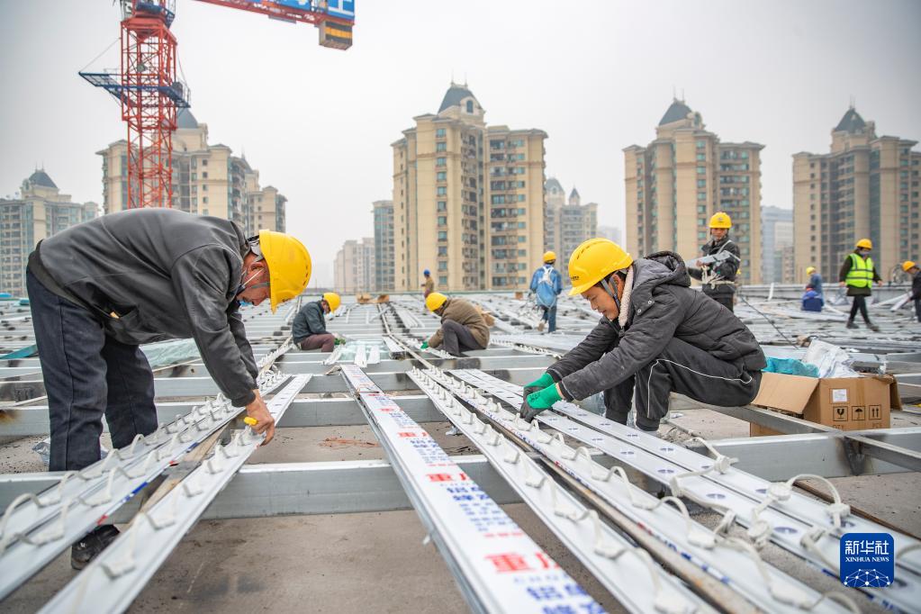 12月16日,在重慶市永川區西部科技影視基地項目,施工人員安裝幕墻燈飾材料。