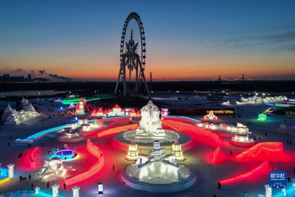 12月17日,游客在哈爾濱冰雪大世界園區游覽(無人機照片)。