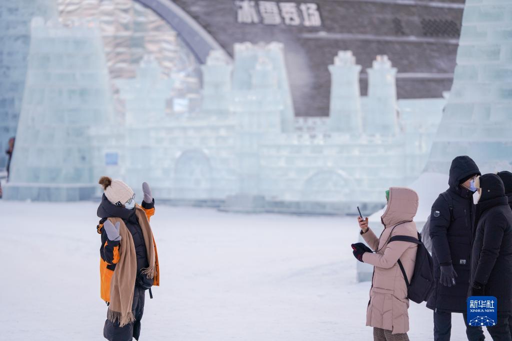 12月17日,游客在哈爾濱冰雪大世界園區游覽、拍照。