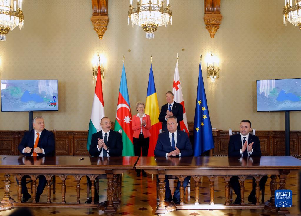 阿塞拜疆、格魯吉亞、羅馬尼亞和匈牙利四國17日在羅首都布加勒斯特簽署綠色能源開發與運輸戰略伙伴協議。據當地媒體報道,該協議將為鋪設黑海海底電纜項目提供資金和技術框架。新華社發(克里斯泰爾攝)