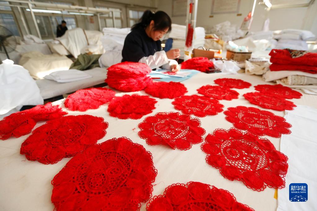 隨著新年臨近,山東省青島市即墨區通濟街道花邊企業的工人忙著加緊生產,滿足國內外市場需求?!凹茨ㄟ叀笔菄壹壏俏镔|文化遺產魯繡的一種,其針法工藝獨特,造型宛如浮雕。近年來,當地花邊企業通過開發設計特色文創產品,開展線上線下定制和銷售,產品暢銷海內外市場,訂單迎來產銷兩旺的良好勢頭。