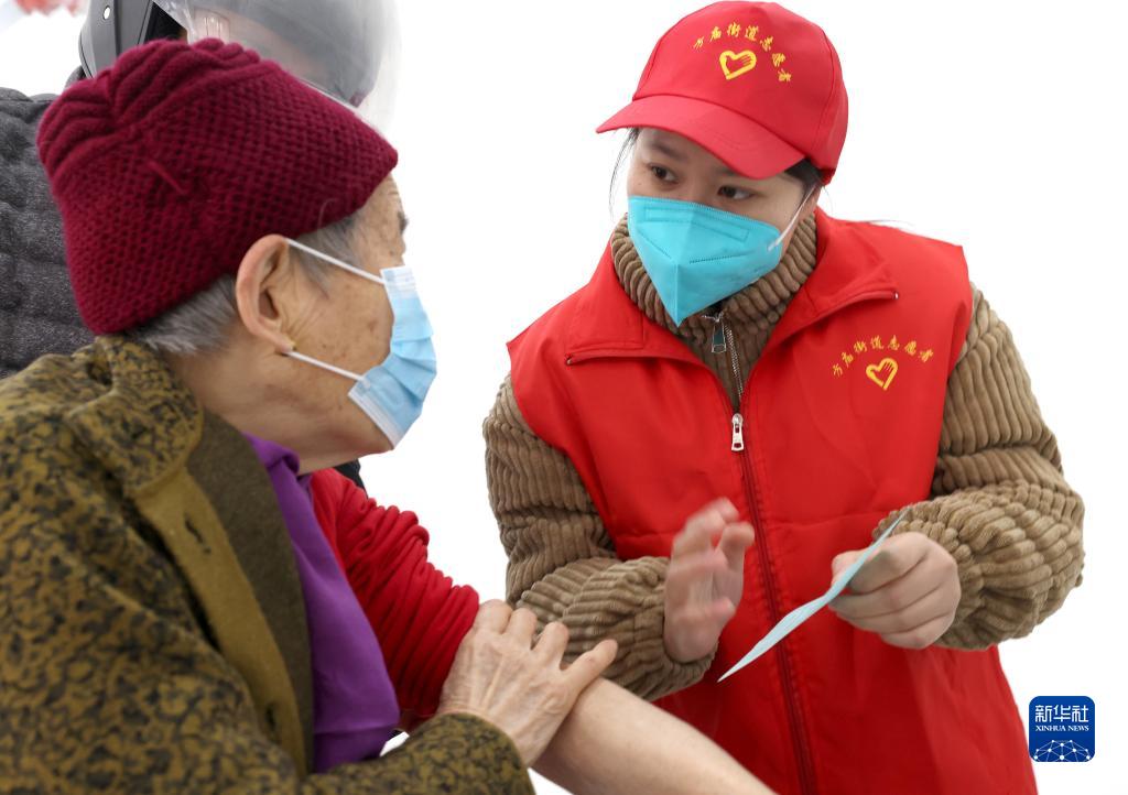 12月10日,在安徽省合肥市瑤海區方廟街道新冠疫苗接種點,方廟街道志愿者汪亞婷(右)給一名接種新冠疫苗的老人講解疫苗接種注意事項。
