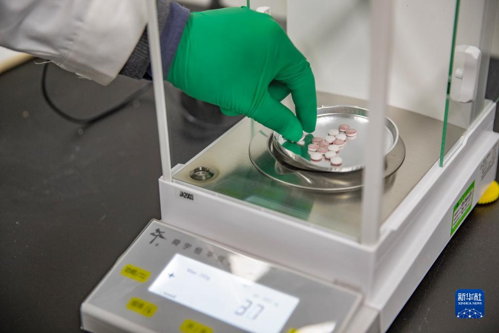 12月16日,在重慶市永川區新領先(重慶)生物醫藥一體化研發服務基地,新領先重慶研究院的研發人員對雙重壓片機壓制的實驗藥品進行稱重查驗。