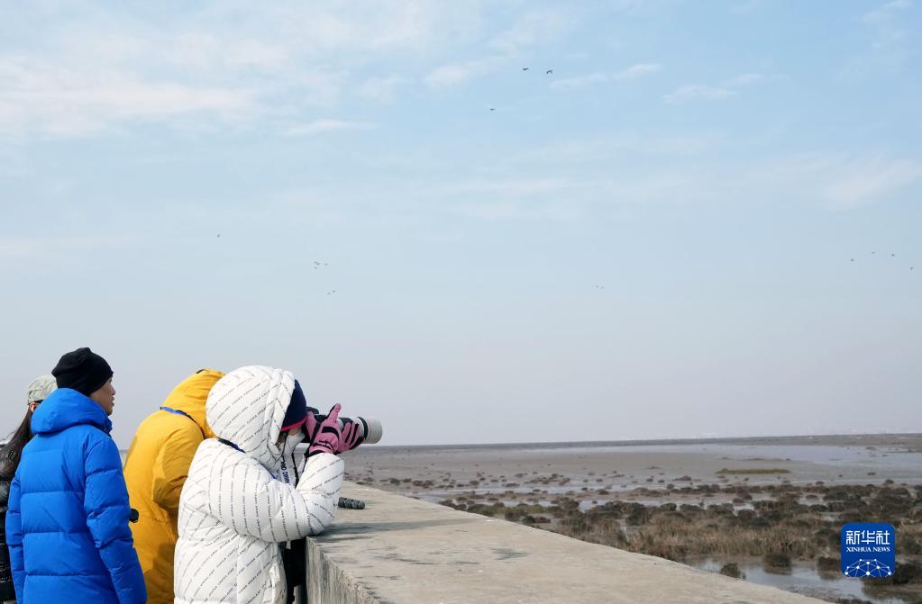 12月17日,在上海崇明東灘自然保護區,濱海社區觀鳥邀請賽的參賽者在觀鳥。