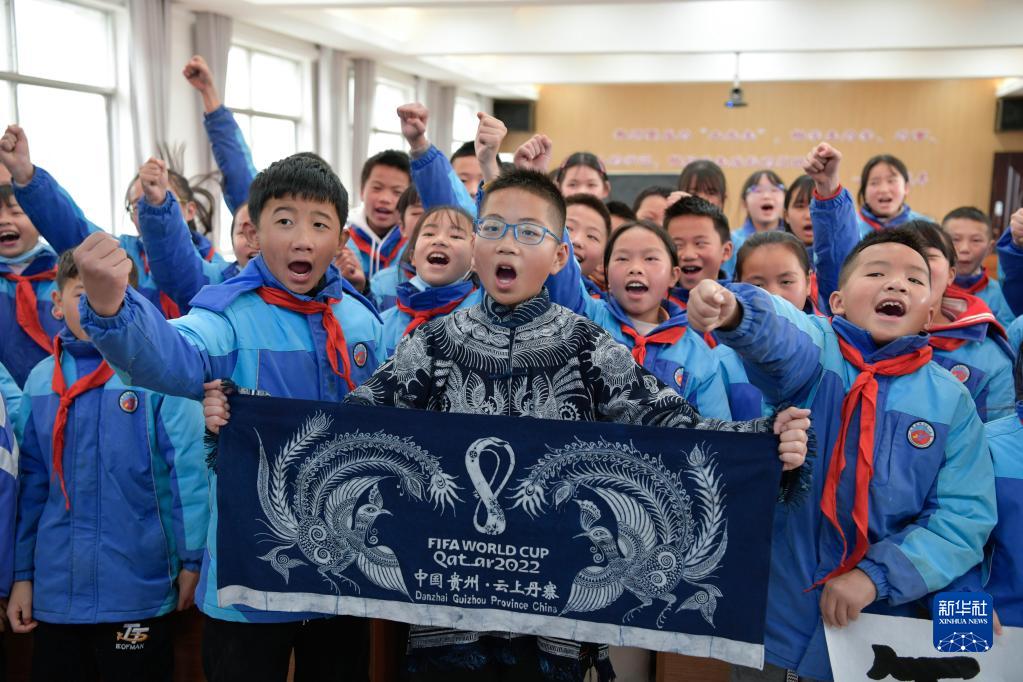 在貴州省丹寨縣城關第一小學,同學們給臨行前的金粲璨(前排右二)加油鼓勁(12月13日攝)。
