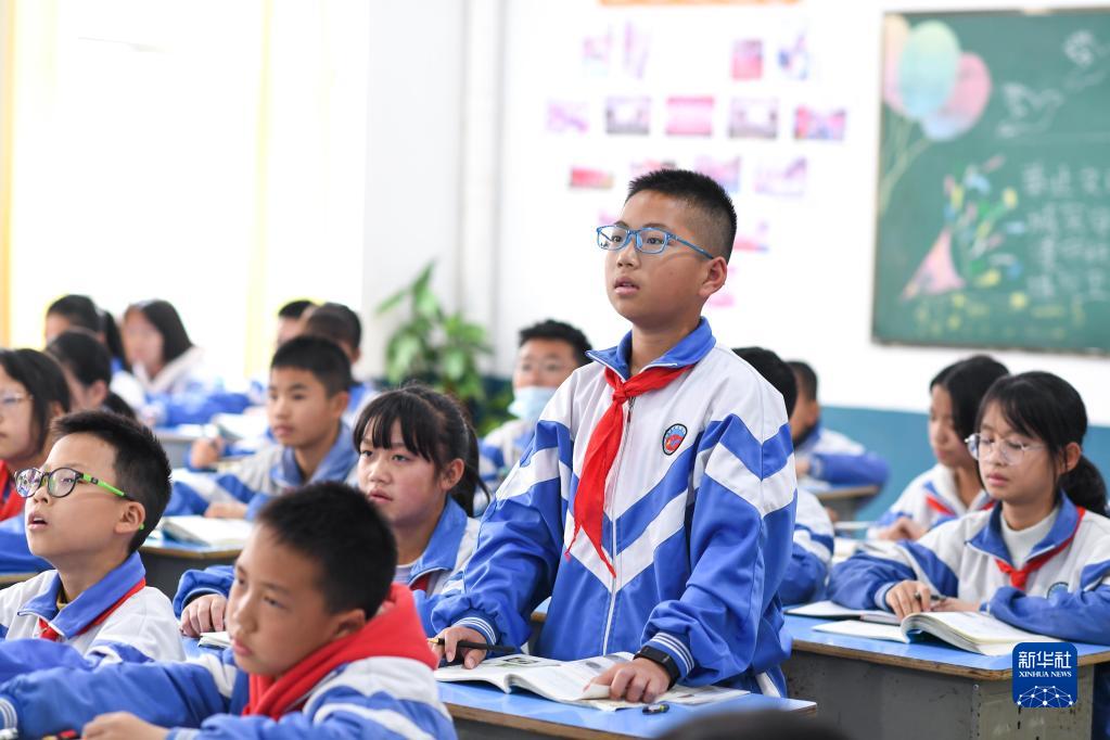 在貴州省丹寨縣城關第一小學,金粲璨起立回答課堂提問(11月15日攝).