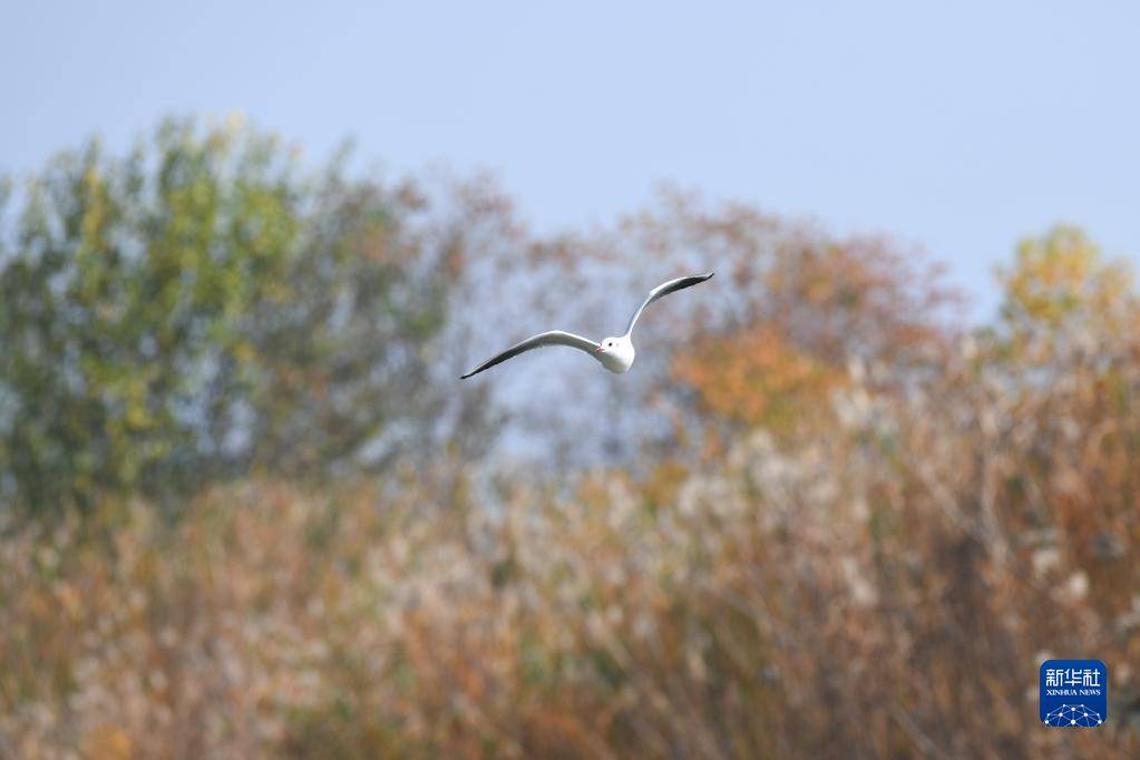 11月24日,一只鳥在合肥市巢湖湖濱濕地飛翔。