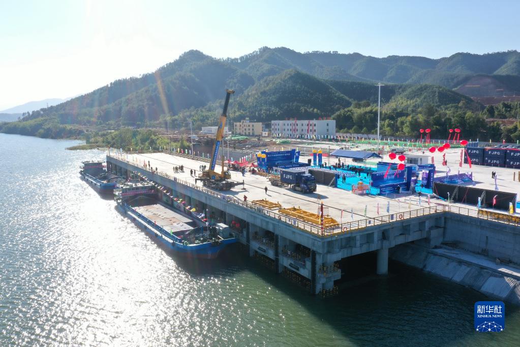 12月18日,“武夷2號”新能源貨船??吭谀掀礁垩悠叫鲁歉蹍^洋坑碼頭裝運貨物(無人機照片)。