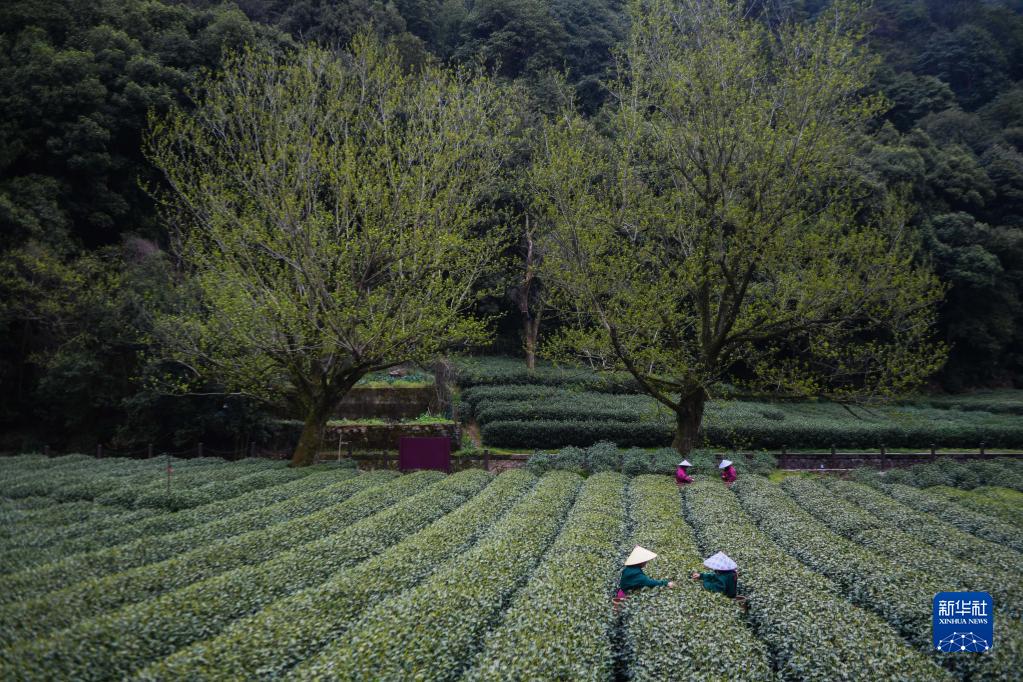 浙江杭州西湖龍井茶一級保護區梅家塢村的茶農在采摘西湖龍井“明前茶”(2022年3月18日攝)。