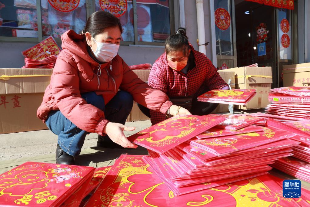 12月18日,在山東省高密市夏莊鎮東李村春聯批發銷售點,客商在挑選春聯產品。
