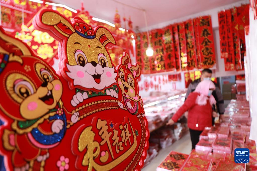 12月18日,在山東省高密市夏莊鎮東李村春聯批發銷售點,客商在挑選春聯產品。