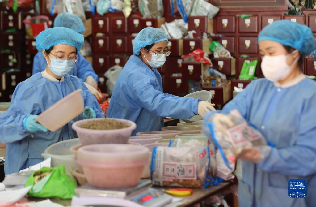 12月19日,山東省臨沂市沂南縣中醫醫院的醫務人員為市民配制中藥。新華社發(王彥冰 攝)
