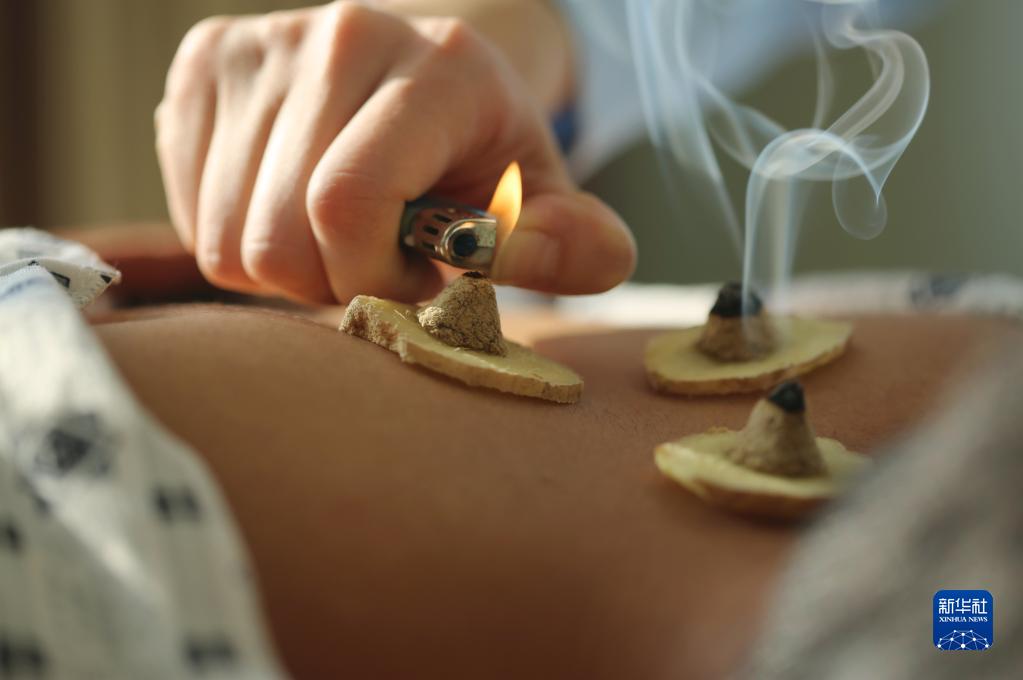 12月19日,山東省臨沂市沂南縣中醫醫院,醫務人員為市民進行穴位艾灸。新華社發(王彥冰 攝)