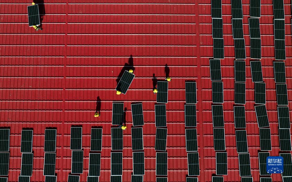 2022年10月11日,工人在河北省唐山市蘆臺經濟開發區一家企業廠房屋頂安裝光伏發電板(無人機照片)。