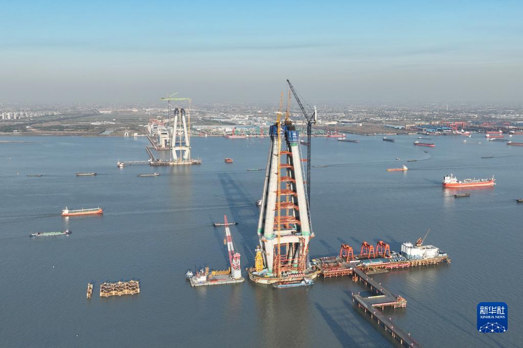 12月19日拍攝的常泰長江大橋6號主塔(無人機照片)。