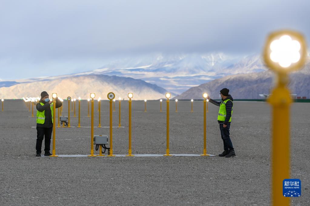 12月19日,在塔什庫爾干紅其拉甫機場,工作人員檢查助航燈光系統。