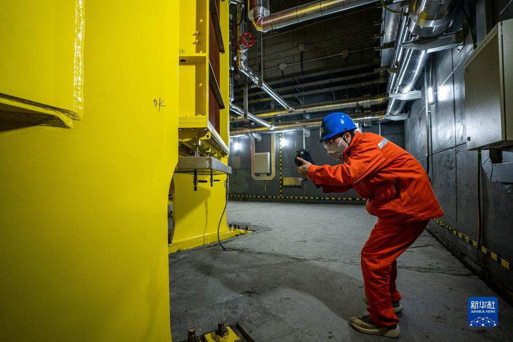12月19日,在白鶴灘水電站右岸地下廠房,工作人員在檢查發電機升溫情況。