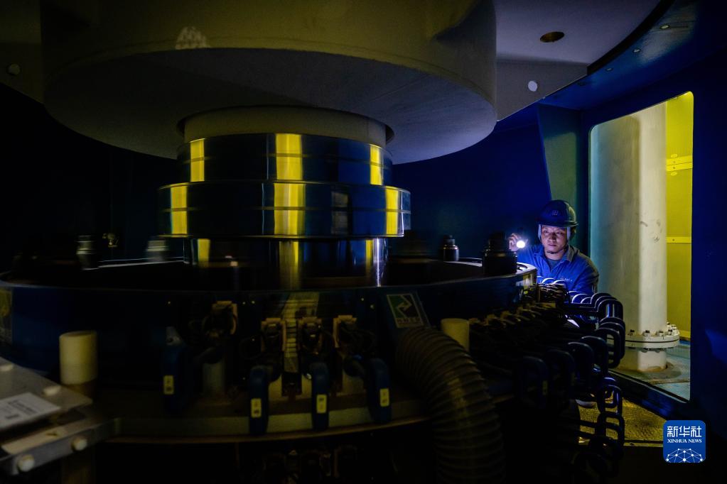 12月19日,在白鶴灘水電站右岸地下廠房,工作人員在檢查集電環運轉情況。