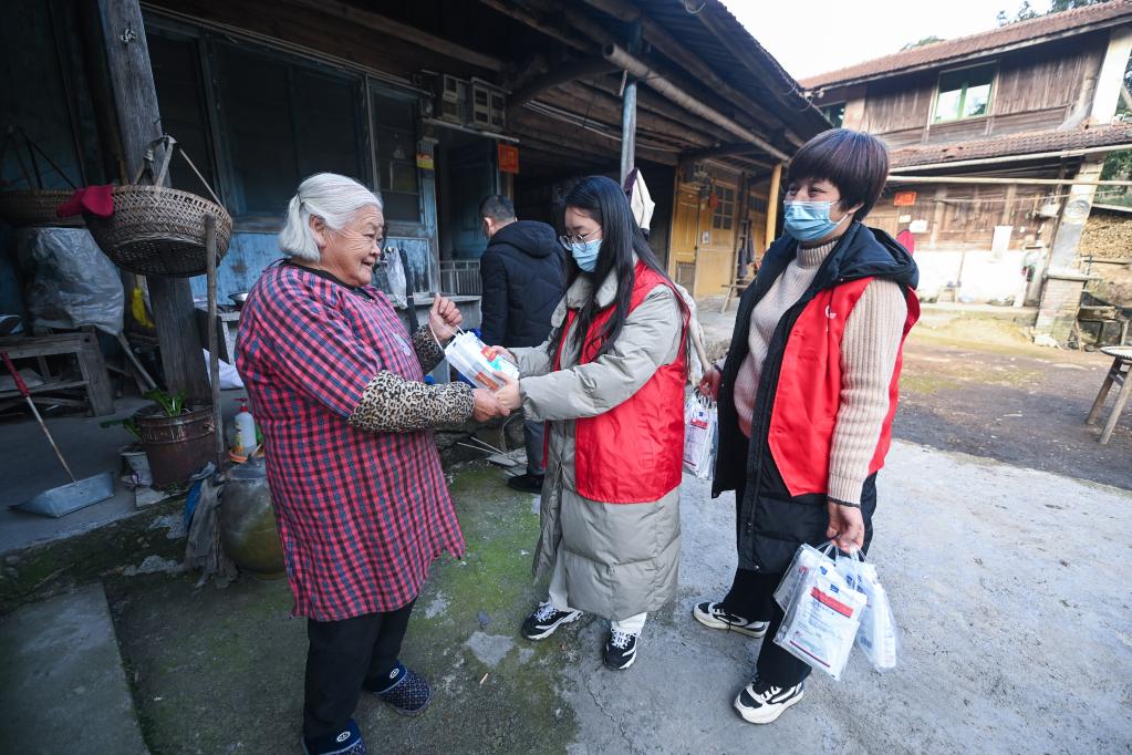 12月20日,在諸暨市東白湖鎮廖宅村,愛心志愿團的志愿者們給住在偏遠山村里的80歲老人蔡愛花(左一)送愛心防疫包,并給她普及日常衛生健康知識。