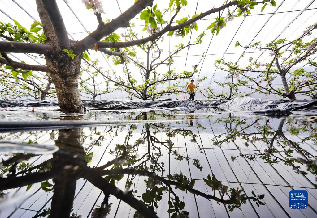 1月11日,河北省灤州市茨榆坨鎮建民種植專業合作社的一名社員在大棚內給櫻桃樹澆水。
