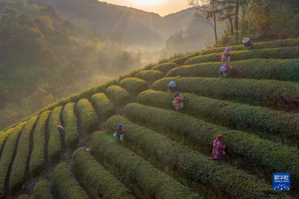 4月3日,采茶工在浙江省余姚市蘭江街道茶園里采摘嫩芽(無人機照片)。