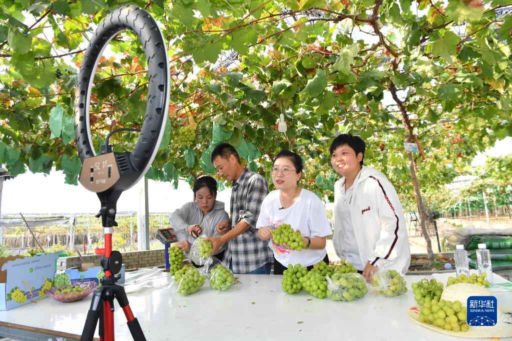 8月9日,在福建省福安市賽岐鎮象環村的葡萄種植園,返鄉創業大學生林恩輝(右二)、陳莉瑾(右一)在推銷剛采摘的葡萄,一旁的果農陳招旺夫婦在裝箱。