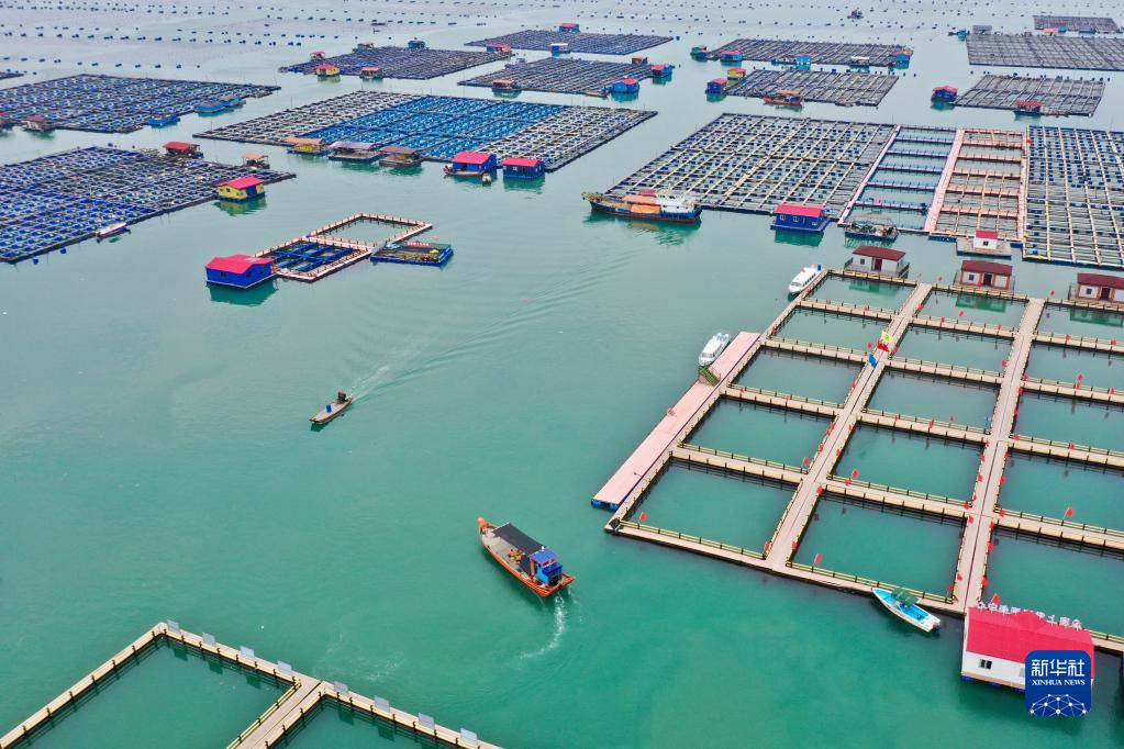 7月1日,游客乘漁船在福建省霞浦縣溪南鎮七星海域深水網箱養殖區參觀(無人機照片)。