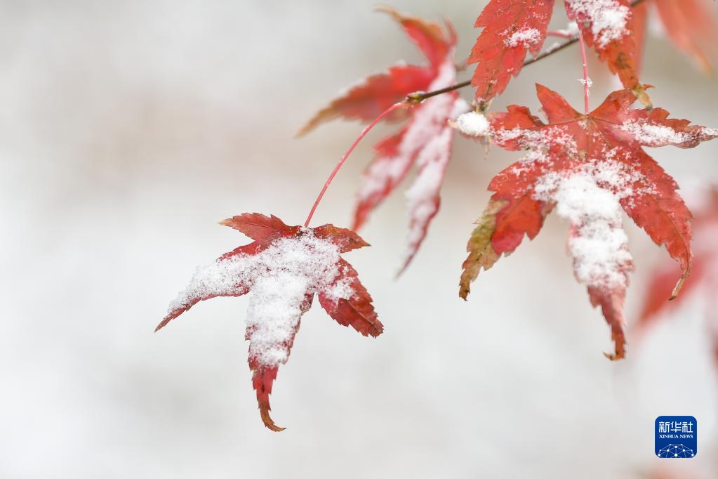 12月17日,在江蘇省南京市紫金山,雪落在紅楓上。