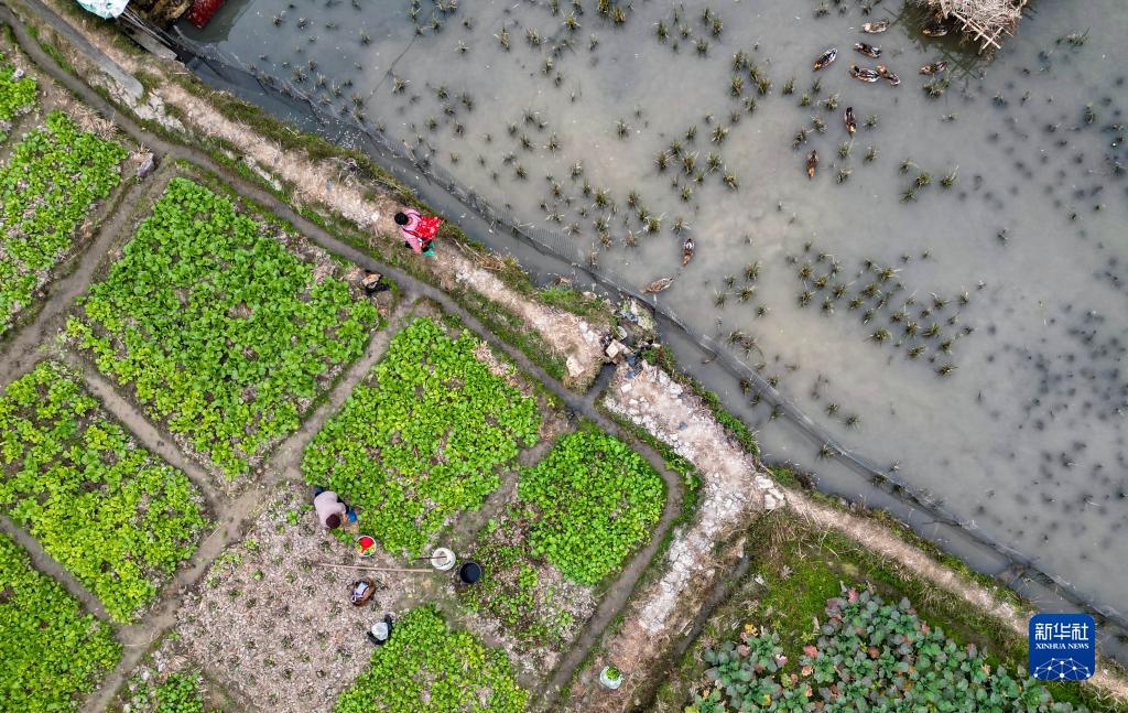 12月20日,村民在貴州省黔東南苗族侗族自治州從江縣貫洞鎮貫洞村田間管護蔬菜(無人機照片)。
