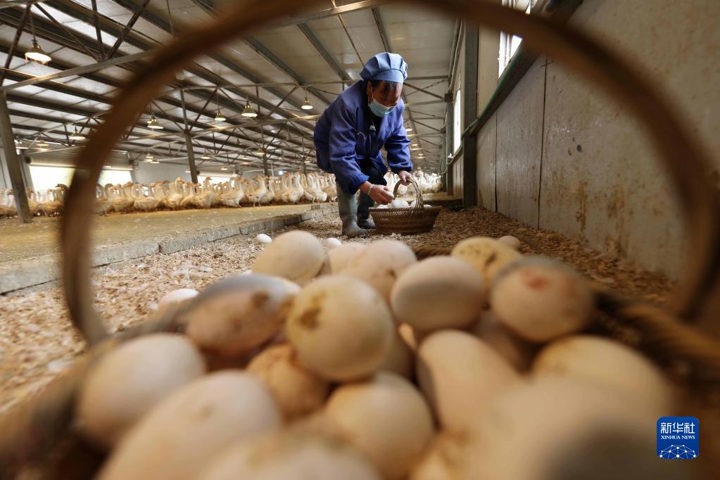 員工在貴州省錦屏縣銅鼓鎮馬臺生態種鵝養殖基地撿鵝蛋(3月22日攝)。