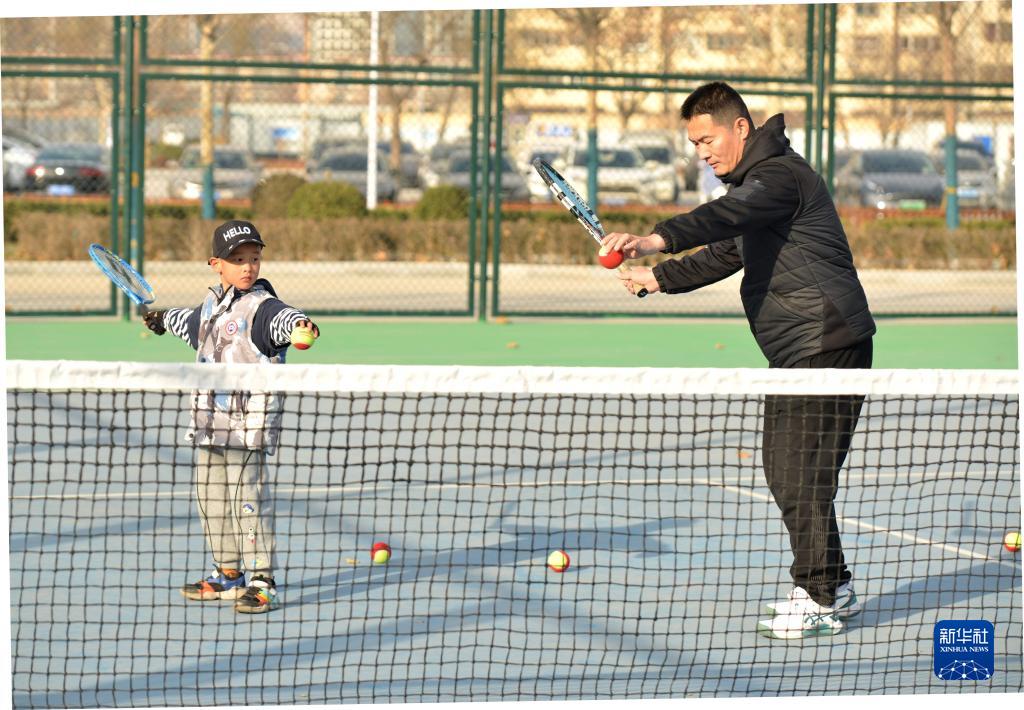 12月21日,一名兒童在石家莊市高鐵片區中央綠色體育公園學習打網球。