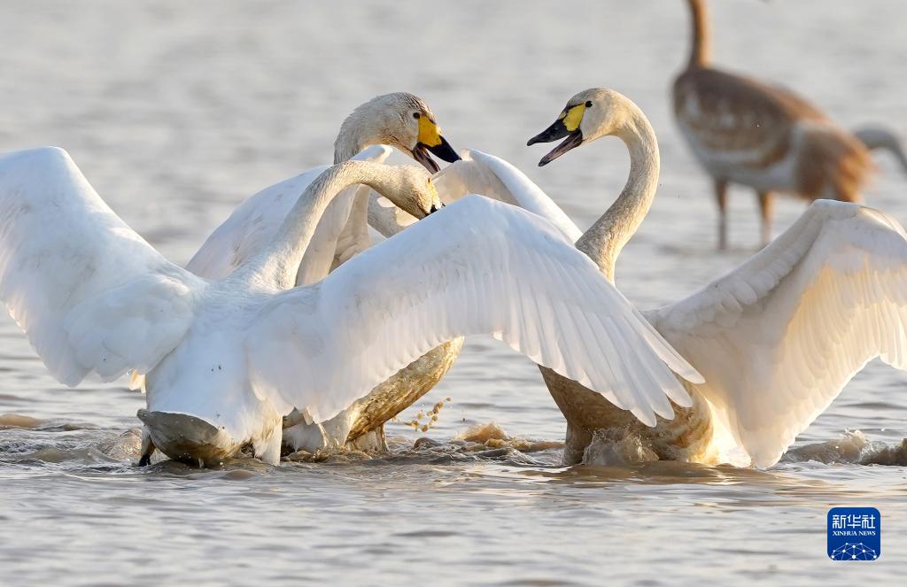 幾只天鵝在南昌高新區五星白鶴保護小區嬉戲(12月21日攝)。