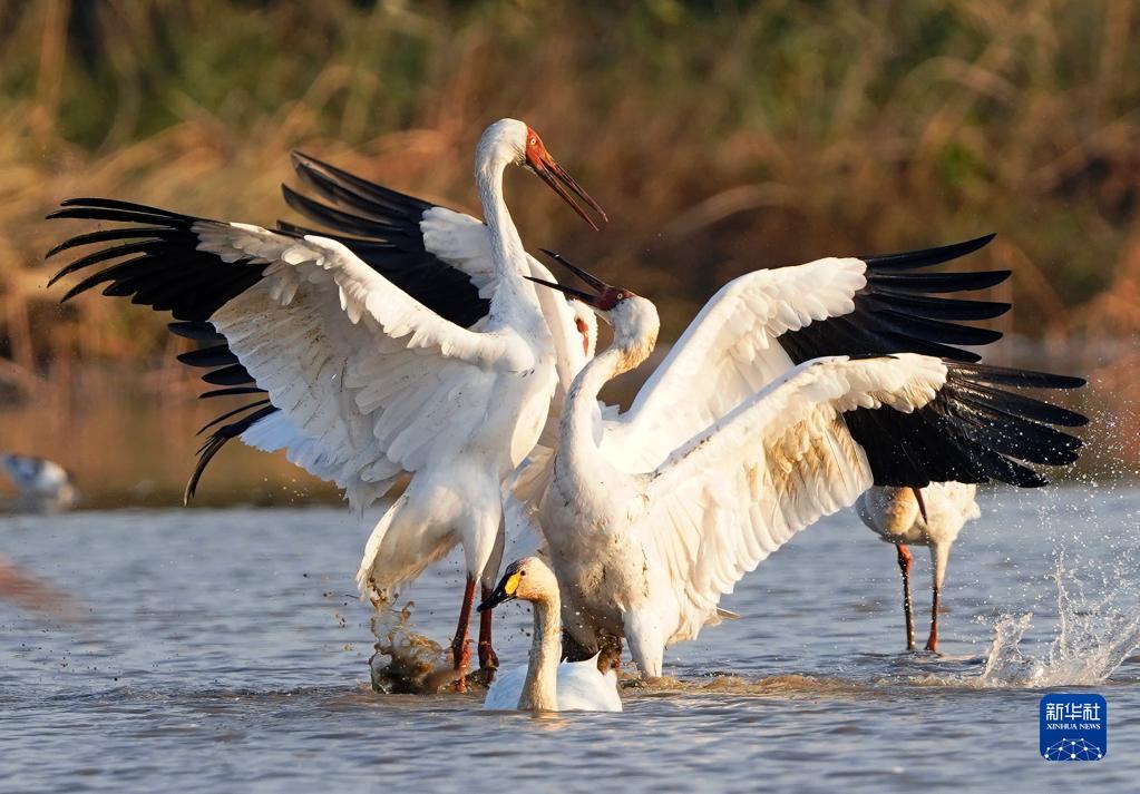 在鄱陽湖畔的五星白鶴保護小區,成百上千只候鳥歡快地嬉戲覓食,享受著鄱陽湖畔的冬日暖陽。鄱陽湖今年遭遇持續干旱,為保護越冬候鳥,愛鳥人士將候鳥常來的藕塘租下來,擴建五星白鶴保護小區,周邊的稻田也只種不收,留給候鳥作食物……這一系列舉措保障了候鳥在此棲息越冬。