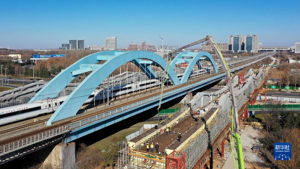 12月22日,中鐵十局的工作人員在對濟鄭高鐵跨濟南經十西路槽型梁進行合龍作業(無人機照片)。