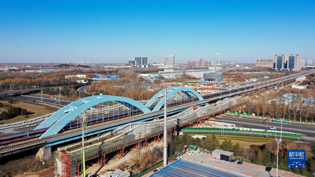 12月22日,中鐵十局的工作人員在對濟鄭高鐵跨濟南經十西路槽型梁進行合龍作業(無人機照片)。
