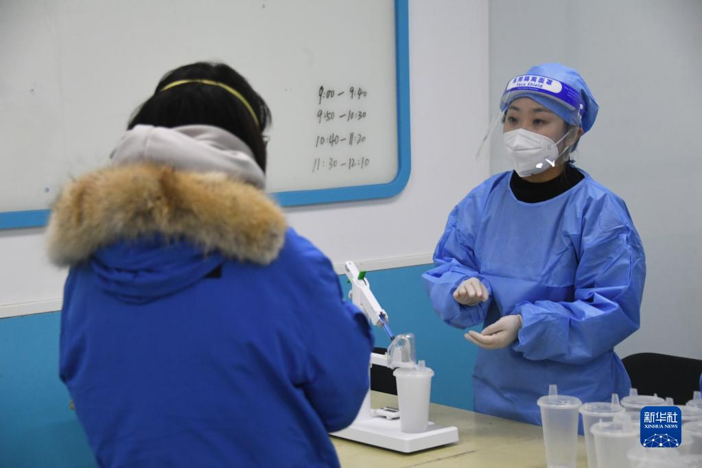 12月21日,在北京市海淀區海淀街道新冠疫苗接種點,醫護人員向市民介紹吸入式新冠疫苗接種方法。