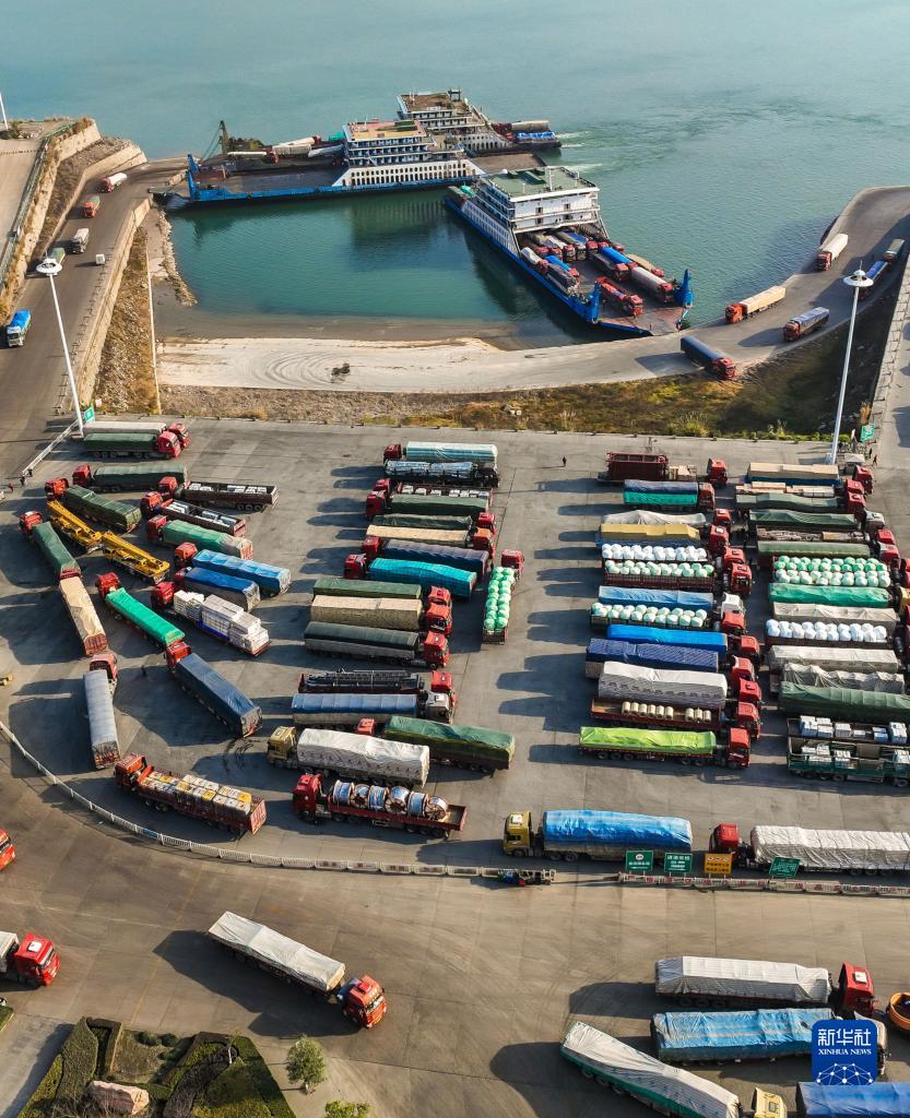12月22日,大型貨車在三峽大壩上游湖北省宜昌市秭歸縣銀杏沱滾裝碼頭上、下船(無人機照片)。