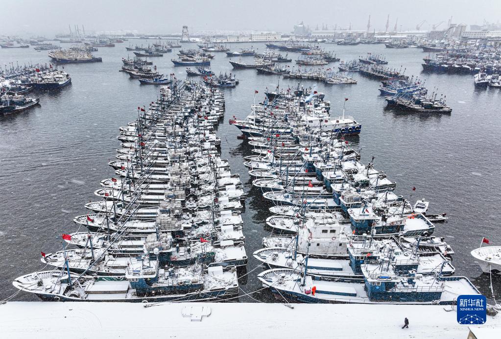 受強冷空氣影響,山東省榮成市近日出現大風降雪天氣。出海作業漁船紛紛??繚O港,躲避寒潮、風雪。