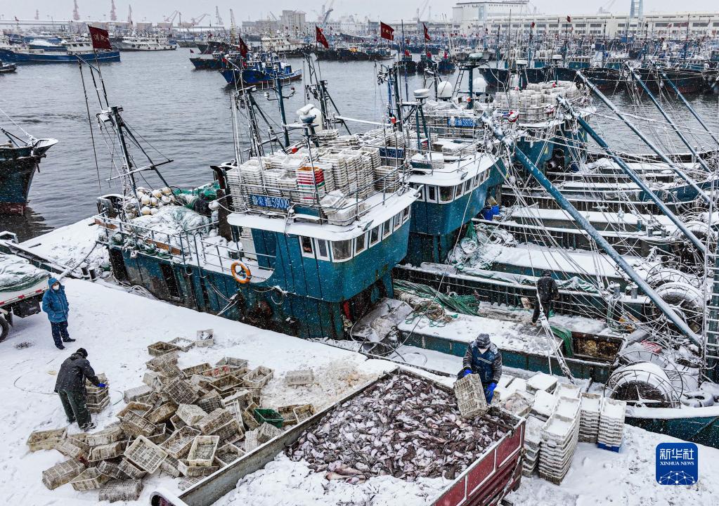 12月22日,在山東省榮成市石島管理區石島漁港,漁民在卸漁獲(無人機照片)。
