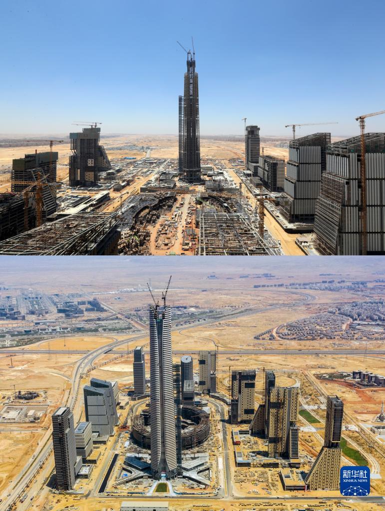 上圖:這是2021年6月17日在埃及開羅附近拍攝的埃及新行政首都中央商務區“標志塔”(中)。新華社記者 隋先凱 攝