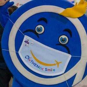 12月22日,在希臘雅典國際機場,一名旅客與機場吉祥物合影。