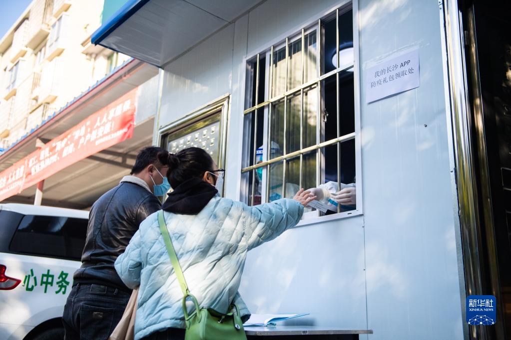 12月23日,在長沙市湘江新區望岳街道社區衛生服務中心,市民在領取防疫健康包。