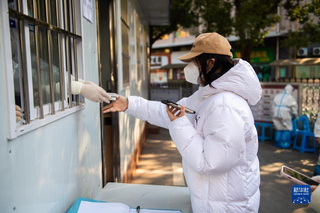 12月23日,在長沙市湘江新區望岳街道社區衛生服務中心,市民在領取防疫健康包。