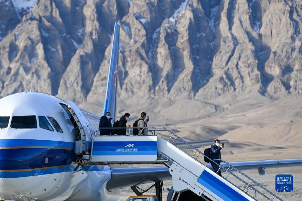 12月23日,在塔什庫爾干紅其拉甫機場,乘坐首航航班的旅客走下飛機。