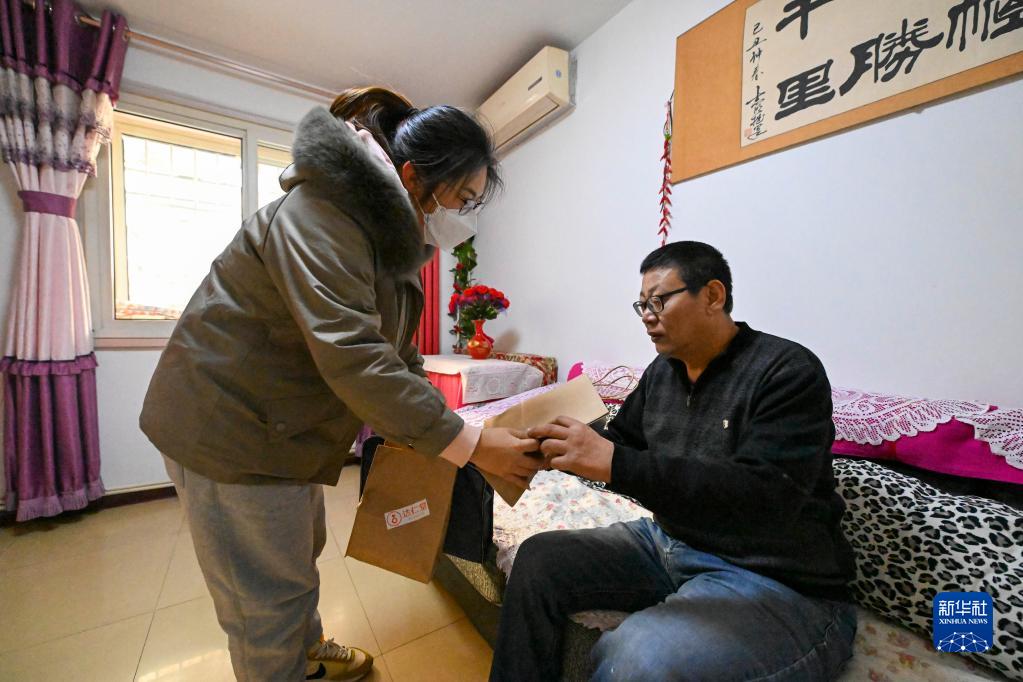 12月23日,在天津市河東區東新街道一小區,沙柳北路社區居委會副主任呂雪(左)將“健康防疫包”入戶送至一位出行不便的居民手中。