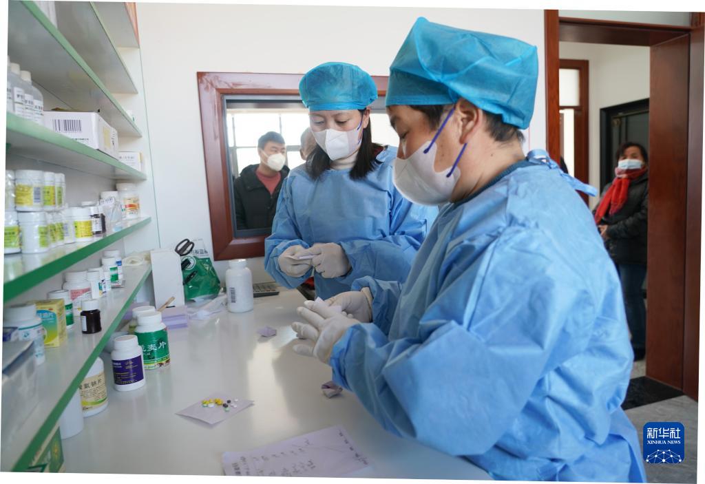 12月22日,在周至縣馬召鎮富饒村東富饒衛生室內,工作人員在為發熱患者包裝藥品。
