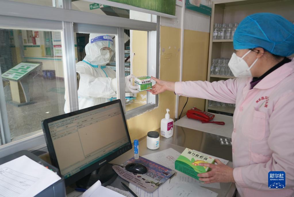 12月22日,在周至縣馬召鎮中心衛生院,護士(左)替患者在藥房取藥。