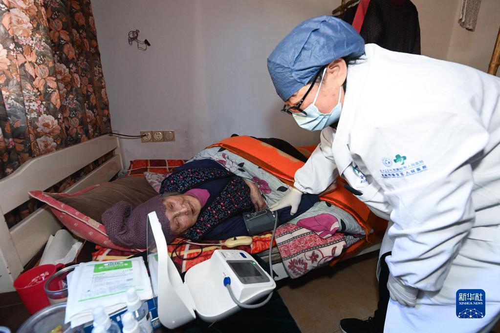 12月23日,在杭州市臨安區太湖源鎮青云村,太湖源鎮衛生院的家庭醫生上門為101歲的吳根花老人進行體檢并送上健康禮包。