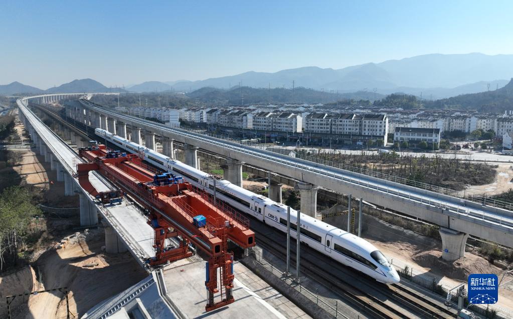 12月23日,在安徽池州,中鐵十一局池黃鐵路站前一標最后一榀箱梁架設完成(無人機照片)。